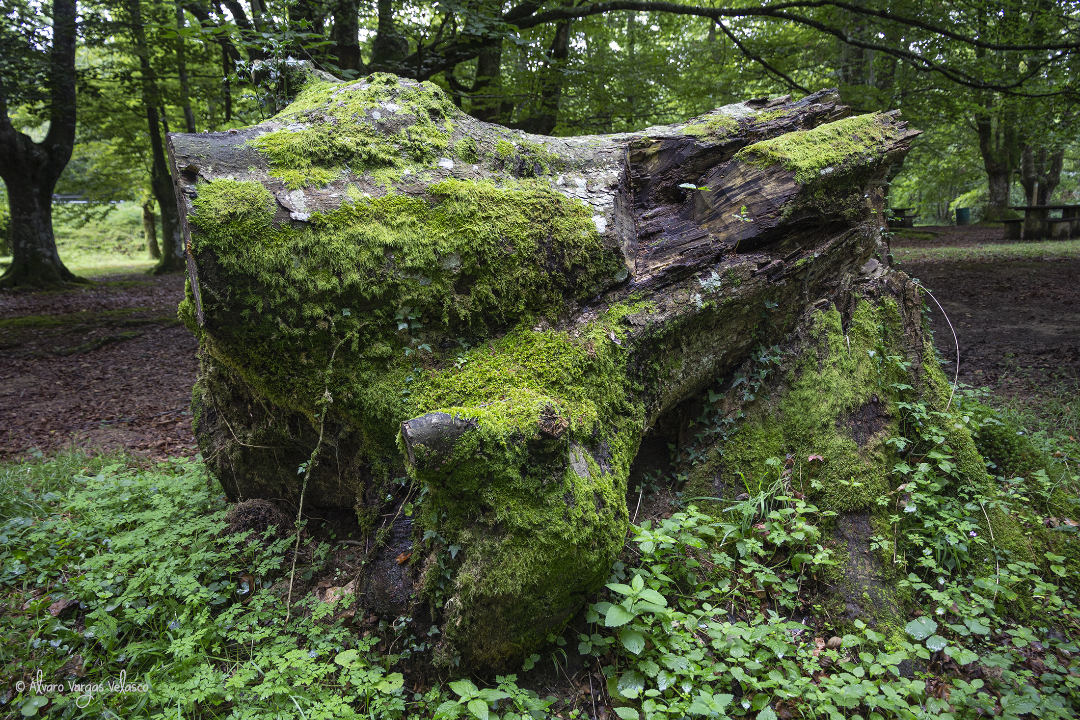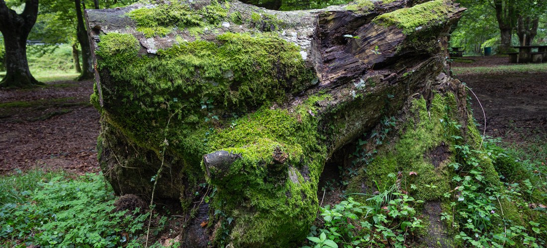 Tocón de haya trasmocha. Madera muerta necesaria para el ecosistema.