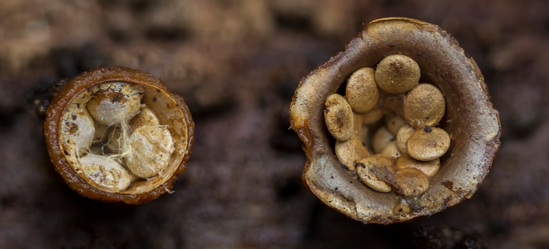Una curiosidad en la que podemos no deparar al observar los ejemplares de Cyathus y Crucibulum es que, las ‘lentejas’ están primeramente unidas por un filamento al endoperidio –más o menos firme según la especie–. A medida que van madurando esta unión desaparecerá y los peridíolos quedarán sueltos, listos para ser dispersados por la lluvia.